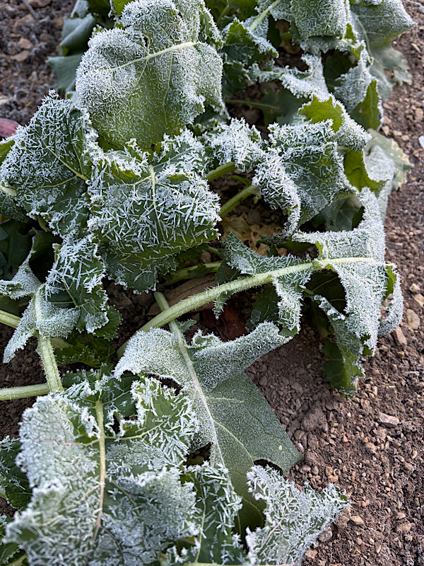 2024 01/09 今朝はこの冬一番の寒さとなり早朝、畑の中を歩くとどこを歩いてもサクサクと霜柱の音が響きました。写真は毎朝、生で食べている水菜です。いつもの様にハサミで根元を切ろうとすると軸の部分が凍っていてポキポキと折れました。こんなことは初めてです。